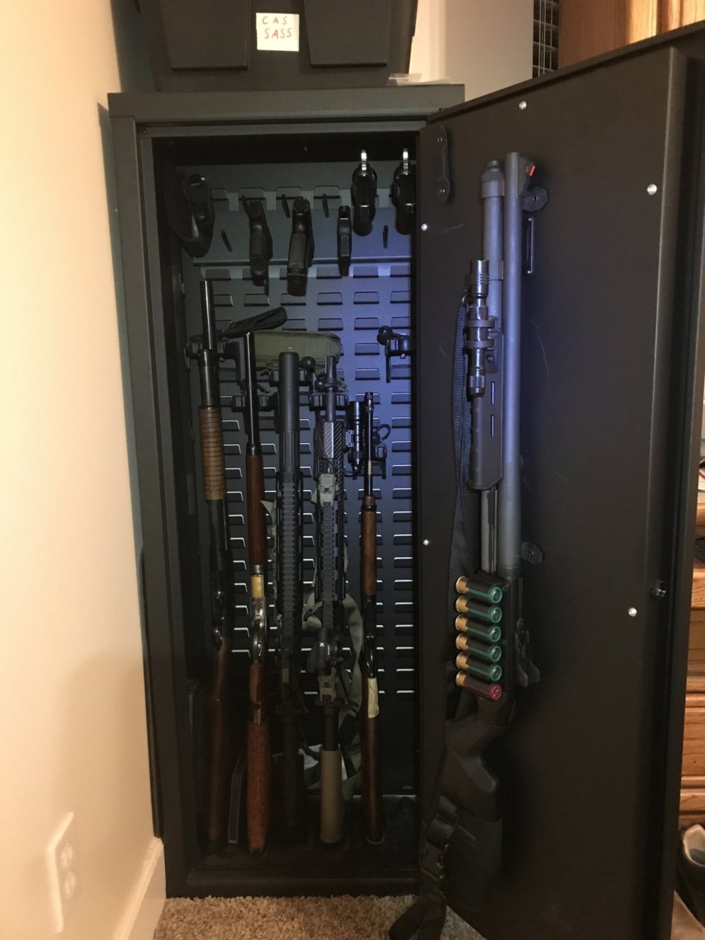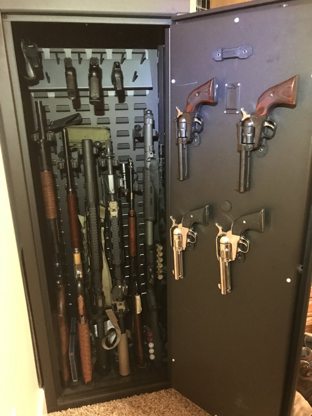 Here is my 52″ agile with 11 peg pistol organizer. Here is my EDC pistols, cowboy guns (dry practicing in my bedroom) and 3 home-defense long guns.
